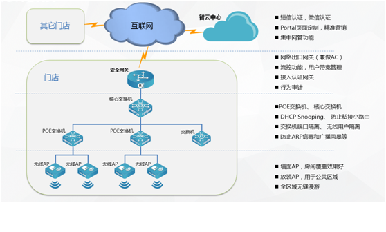 面对移动互联网大潮对传统行业的冲击,运用云计算、移动社交、大数据分析等技术,为酒店、餐饮、休闲娱乐、零售商超等商业市场客户构建基础网络平台,加速商业市场客户业务创新和转型已经刻不容缓,710公海赌赌船官网智云商业解决方案志在为商业客户给予最强的用户体验,给予最具商业价值的云网络,给予基于portal认证,短信、微信营销功能。
