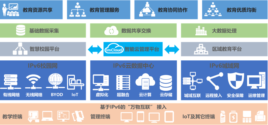 本方案对教育城域网系统以IPv6技术为核心、按照云管理架构进行总体设计,以灵活的有线无线一体化基础网络给予基于IPv6的“万物互联”接入,形成IPv6校园网、IPv6城域网互联、IPv6云数据中心三大网络模块,构建智慧校园平台和区域教育平台两大平台,并应用统一智能云端融合管理为系统运行给予有力支撑和有效保障,在此之上采用基础数据采集、数据共享交换、大数据处理等手段,实现城域网教育资源共享、教育管理服务、教育协同协作,最终以达到教育优质均衡的目标。