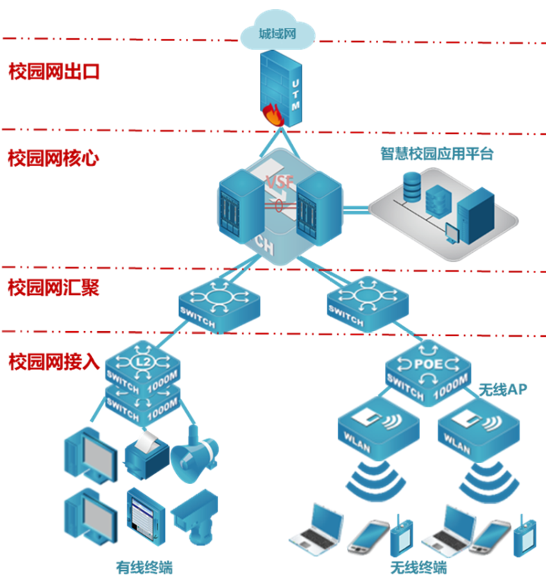 大型学校校园网有线无线接入终端数量较多、校内自有业务应用系统也比较丰富,对于网络性能、可靠性、容量等各方面要求都相对较高,因此采取了双核心虚拟化部署、关键链路冗余的设计,在设备选型上也充分考虑设备性能、自身可靠性、网络特性、扩展能力等多方面因素。